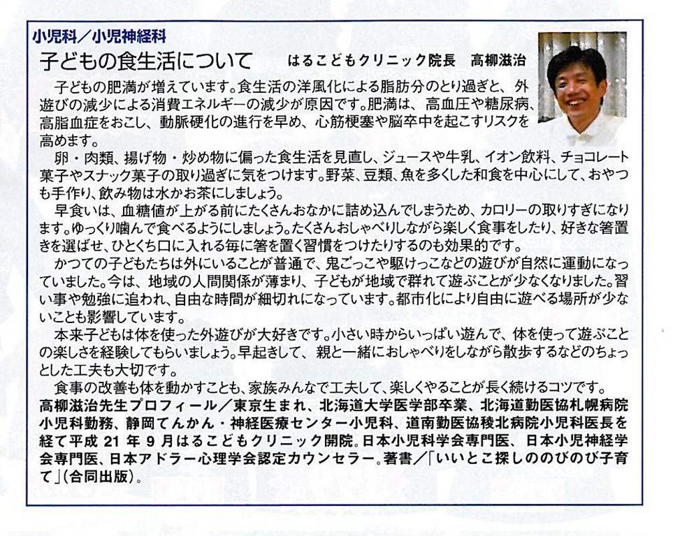 「子どもの食生活について」という題で、肥満の子どもの食生活と運動の注意に関して書かれています。