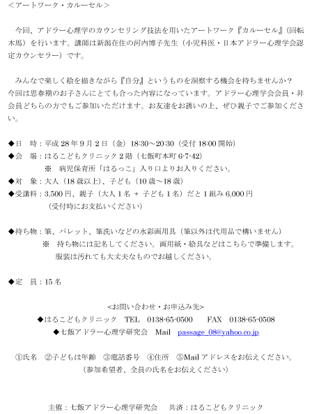 平成28年9月2日(金)にアドラー心理学のカウンセリング技法を用いたアートワーク『カルーセル』(回転木馬)を行います。講師は新潟在住の河内博子先生(小児科医・日本アドラー心理学会認定カウンセラー)です。
